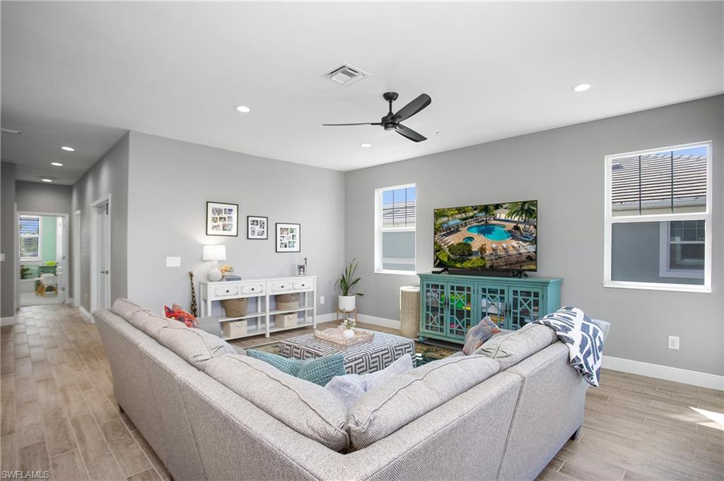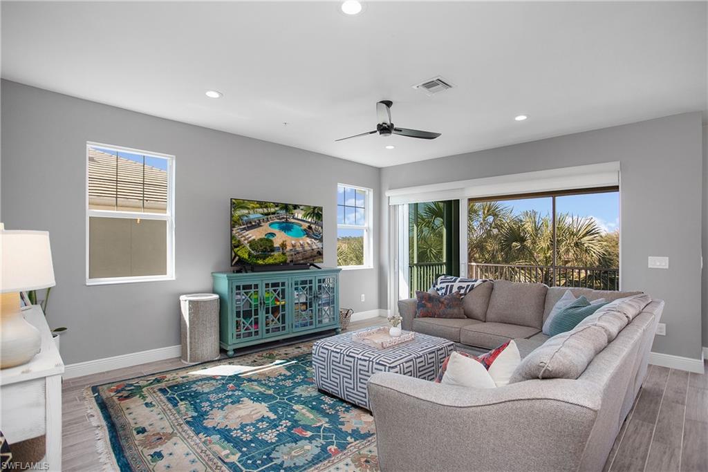 This elegant coach home located in desirable Richmond Park provides breathtaking sunset and lake views from the expansive lanai. This spacious end unit features over 1600 square feet, 3-bedrooms, 2-bathrooms, a 1-car attached garage and is on the 2nd floor, with no unit above you. You'll appreciate the hurricane impact glass throughout, soaring volume ceilings and an open concept floor plan with tons of natural light. Multiple access points to the lanai from the living, dining and main bedroom areas. The gorgeous kitchen provides a large island with plenty of seating and storage space, a walk-in pantry, white shaker cabinets, quartz counters, herringbone white subway tile backsplash and stainless-steel appliances. Enjoy the natural beauty of this community with lush landscaping all around. Amenities include a clubhouse and large community pool and spa. With a highly sought-after North Naples location just East of Collier Blvd. off of Immokalee Rd, in an A-rated school district, you'll have easy access to I-75, world-class dining, shopping, entertainment and just a short drive to beautiful Gulf beaches!